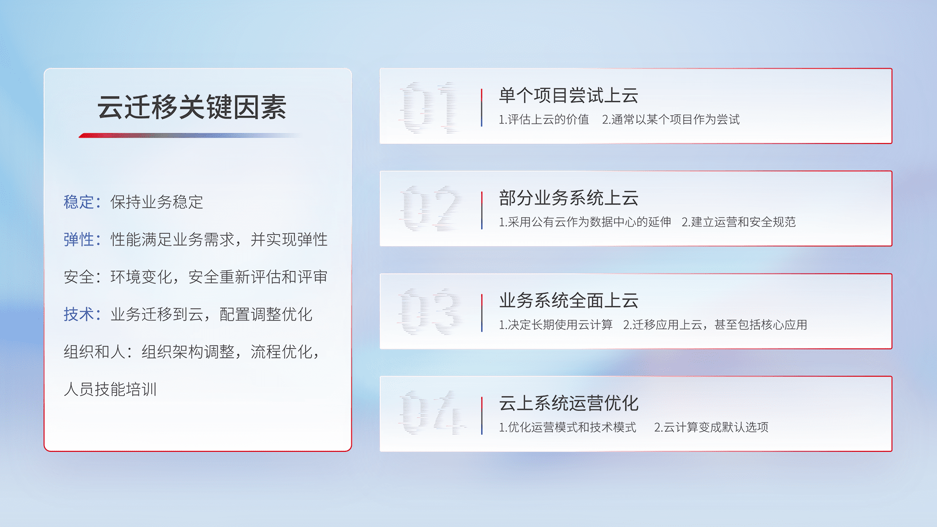 结合实际业务,,,,从规划设计、、、、云平台选型、、、云原生改造、、数据迁移、、、集成交付,,,,迁移全过程为客户识别最佳上云路径,,,,做好风险识别管理,,,,设计网络架构、、、身份权限、、安全审计合规、、、、操作审计、、、、日志审计、、监控告警策略、、多站点容灾设计等,,对云上基础设施进行整体规划,,提升IT治理水平,,,以满足弹性、、、高可用、、、、高性能的需求。。。。